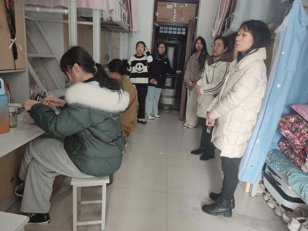 走访宿舍期间,领导及老师与同学们亲切交谈,气氛融洽。老师们询问了解学生假期生活中的思想状况,并且温馨提醒同学们第一:在宿舍注意卫生和用电安全;第二:在临近考试期间,要注意调整作息规律,合理饮食,用最好的状态来迎接考试;第三:学习防诈骗知识,谨防上当受骗;第四:请同学们多参加学校和学院举办的各项比赛和活动;第五:如果同学们有哪些困难和需求,我们会及时给与关怀和帮助。