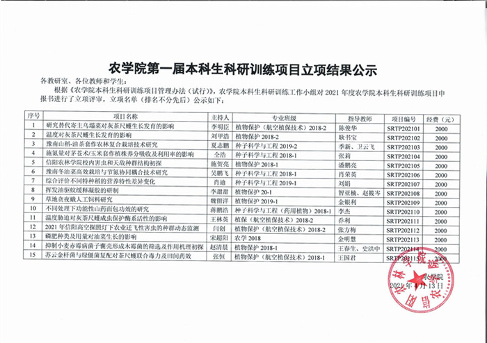最后,尹健院长宣布了立项名单,鼓励指导教师对项目认真指导,引导学生认真进行科研训练,提高科研能力,多出科研成果。(农学院 耿书宝)