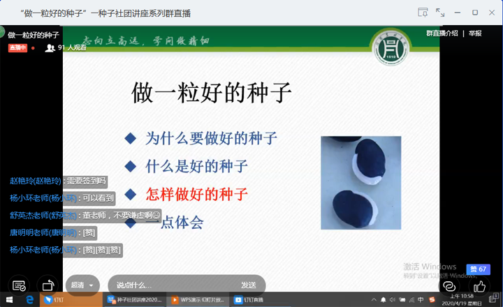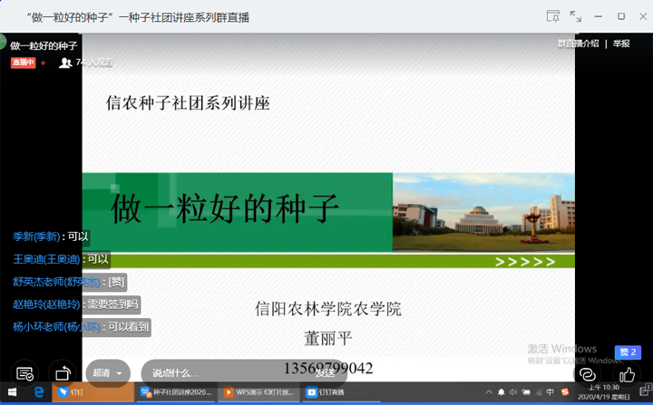 活动以线上专题讲座的形式展开。我院专业教师董丽平借助“钉钉”平台以“做一粒好的种子”为题,从“为什么要做好的种子、什么是好的种子、怎样做好的种子”三个方面向大家讲述了种子的重要性、好的种子应该具备的特点及为了做好的种子我们努力的方向。此外,董老师还向大家分享了自己的体会,她认为作为种子专业的学生,未来中国种业的主力军,要学好种子知识,为农业农村农民提供“一粒好的种子”;作为大学生中的一员,未来中国梦的实践者与实施者,要端正学习、生活、做事态度,让自己作为“一粒好的种子”,在社会的土壤上生根、发芽,并开出美丽的花,结出丰硕的果。作为来自农村、学习农业知识的我们,应该树立立志为农、服务农业的远大理想。