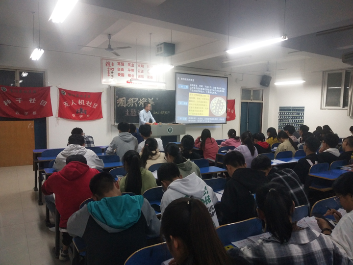 2019年10月30日晚,在一教205教室,我院季新博士为无土栽培社团、种子社团和无人机社团联合举办了植物组织培养专题讲座。