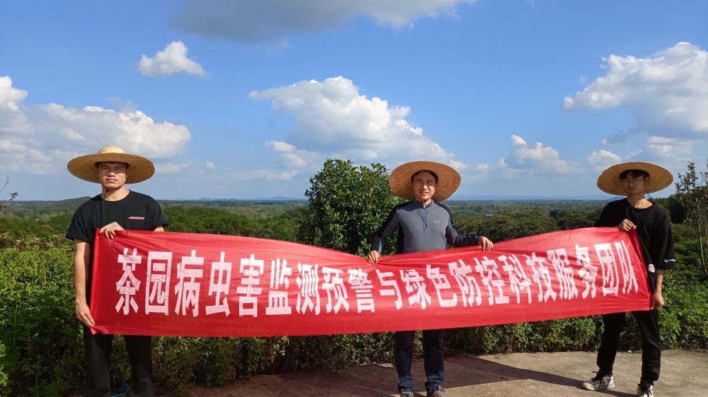2023年9月14日,我院科技特派员、茶园病虫害监测预警与绿色防控科技服务团队耿书宝博士带领张文烜、宋君川、校志新3名学生,前往信阳申林茶叶有限开发公司、亿峰生态林业开发有限公司开展科技服务工作,调查茶园主要害虫发生情况。