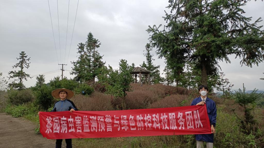 2023年9月27日,我院科技特派员、茶园病虫害监测预警与绿色防控科技服务团队耿书宝博士带领张文烜、宋君川2名学生,前往信阳申林茶叶有限开发公司、亿峰生态林业开发有限公司开展科技服务工作,调查茶园主要害虫发生情况。