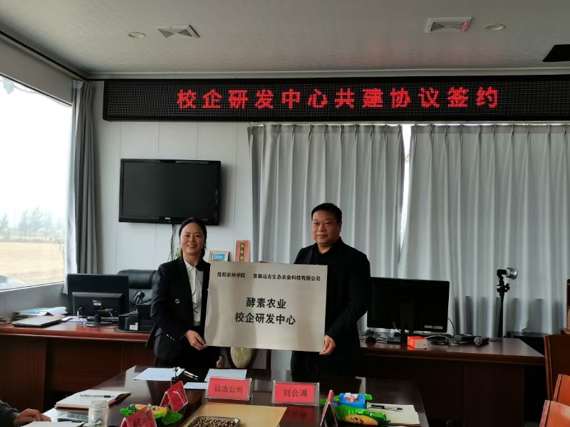 我院副院长刘合满教授和远古生态有限公司总经理王春玲签订了校企共建研发中心合作协议。科技处、校地合作处处长刘纪成为“酵素农业校企研发中心”挂牌。