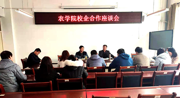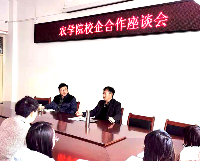 会上,尹院长首先对潘兹亮研究员的到来表示欢迎,详细介绍了植物保护教研室的师资队伍、教学、科研及学生实习实训情况,并强调在培养学生实践能力,提高综合素质方面需要进一步加强与科研院所、相关企业的合作,充分发挥专业优势,通过合作为提高学生专业技能,提供教师科研场所,也为服务当地农业搭建平台。潘兹亮研究员也表达了对本次座谈的期望,讲述了资源环境研究所与农学院的渊源情谊,并介绍了资源与环境研究所承担的国家红麻实验站和绿肥实验站研究内容及科研进展情况,以及鸿润家庭农场的企业规划、工作内容和发展前景,并表示该所拥有的试验田及家庭农场的20万亩种植基地都可以作为教师和学生科研基地,实习实训基地。