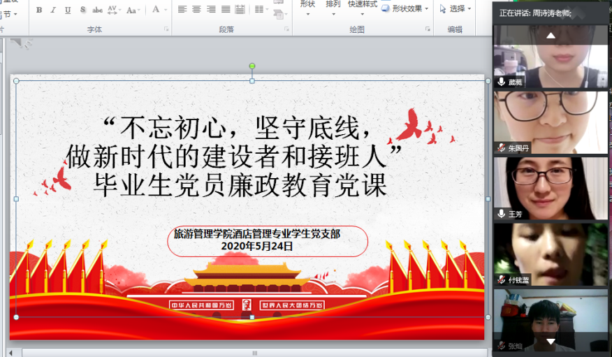 为进一步增强毕业生党员的党性修养和廉洁自律意识,引导他们走好职场第一步,2020年5月24日,旅游管理学院酒店管理专业学生党支部开展“不忘初心,坚守底线,做新时代的建设者和接班人”毕业生党员廉政教育党课。支部全体毕业生党员、主要学生干部参加,党课由支部书记周诗涛主讲。