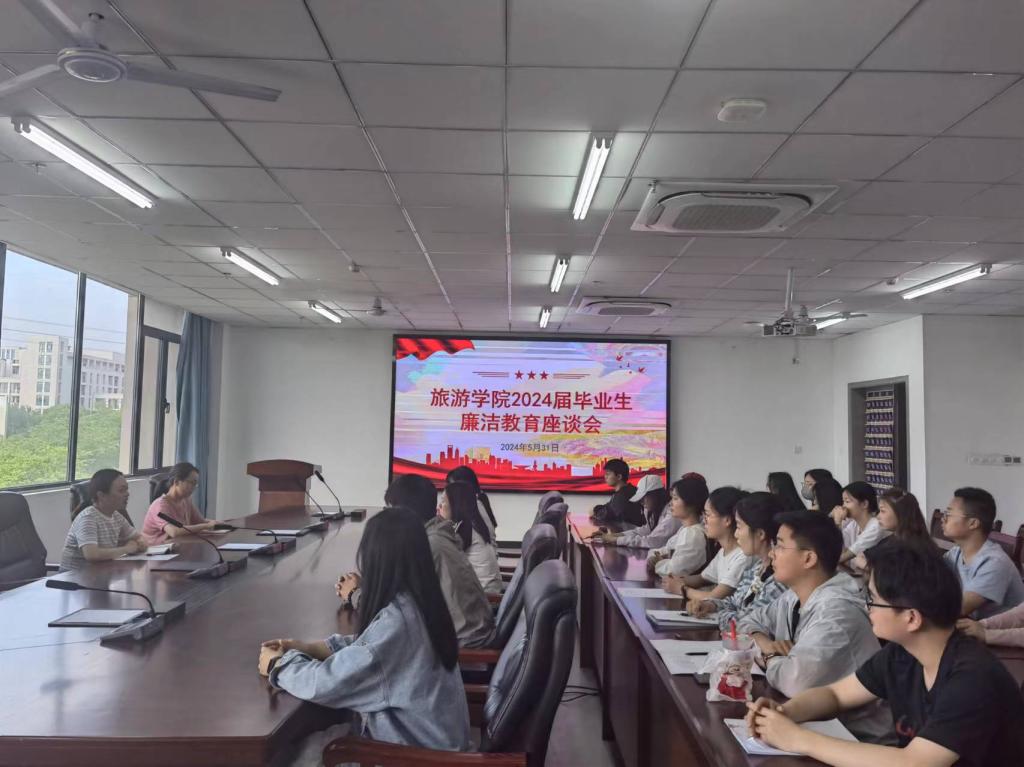 为筑牢毕业生廉洁从业思想道德防线,提高毕业生拒腐防变和自我保护能力,旅游学院于2024年5月31日下午召开了2024届毕业生廉洁教育座谈会。党总支副书记池水婧主持会议,专职组织员张音音、2024届毕业生学生干部和党员代表参加本次座谈会。
