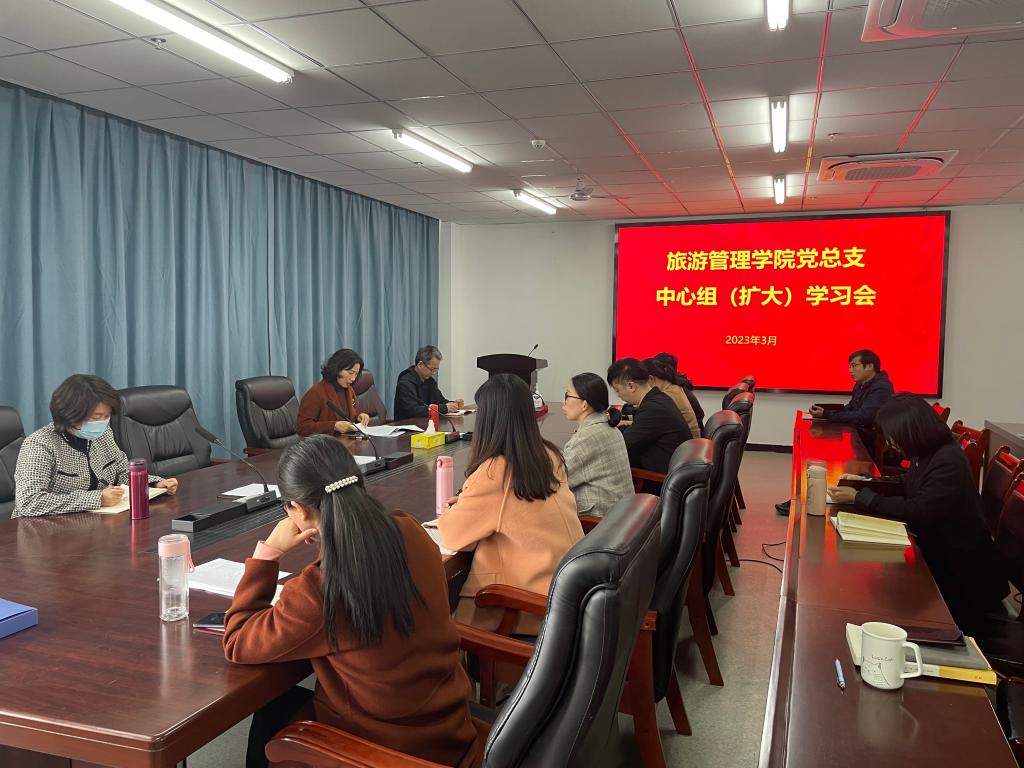 3月14日下午,旅游管理学院党总支在双创中心310会议室召开中心组(扩大)学习会。会议由党总支副书记杜丽主持,学院班子成员参加会议,院科级干部及各支部书记列席。