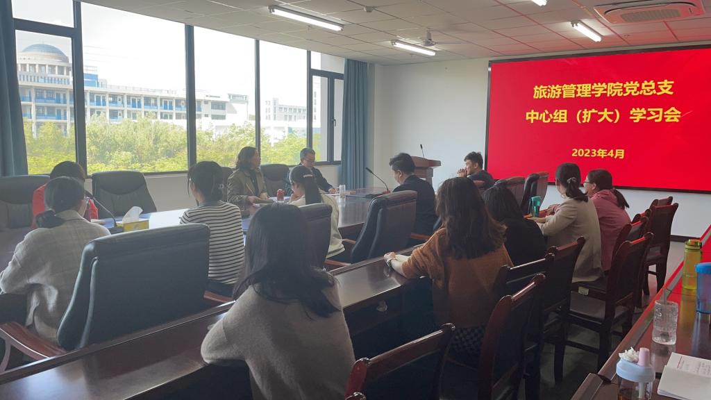 4月25日下午,旅游管理学院党总支在双创中心310会议室召开中心组(扩大)学习会。会议由党总支副书记杜丽主持,学院班子成员参加会议,院科级干部及各支部书记列席。