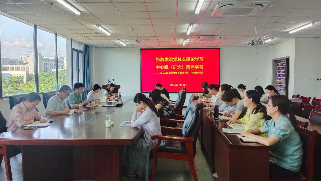 7月2日,旅游学院党总支召开理论学习中心组(扩大)集体学习会,专题学习党的工作纪律、生活纪律。学院领导班子成员、科级干部、党支部书记参会,会议由党总支书记朱长明主持。