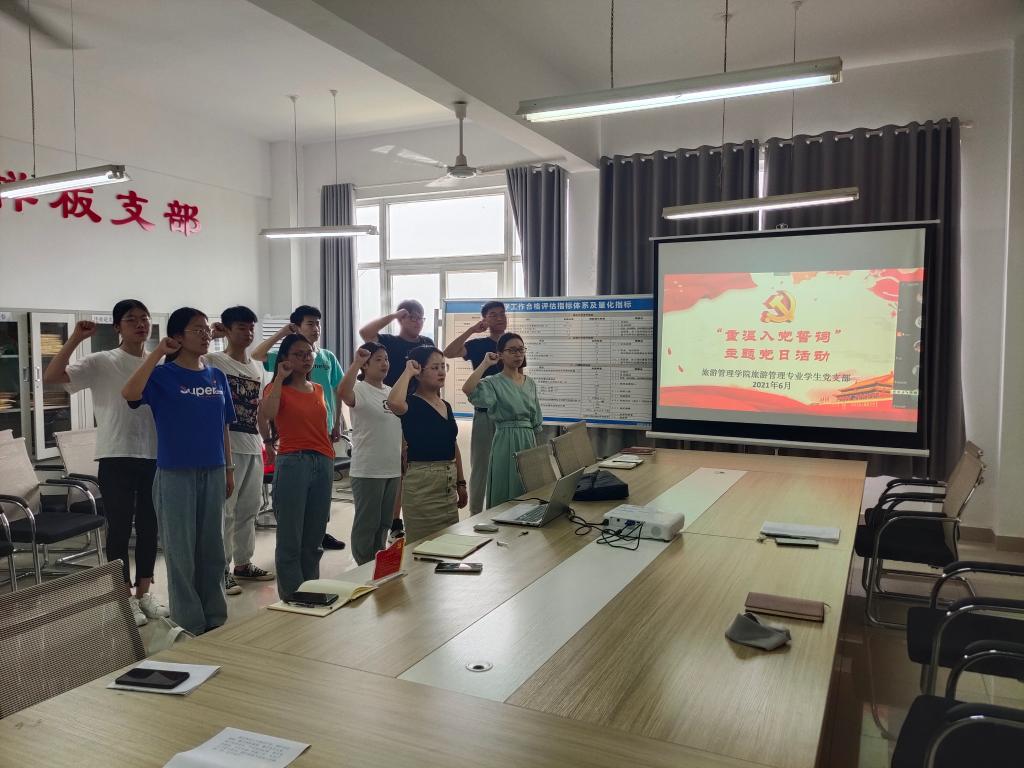 党旗鲜艳催奋进,誓词铮铮更强劲。为热烈庆祝中国共产党成立100周年,6月15日,旅游管理专业学生党支部在2B510开展了“重温入党誓词”主题党日活动。会议由支部书记徐晓琰主持,支部全体党员参加了此次活动。