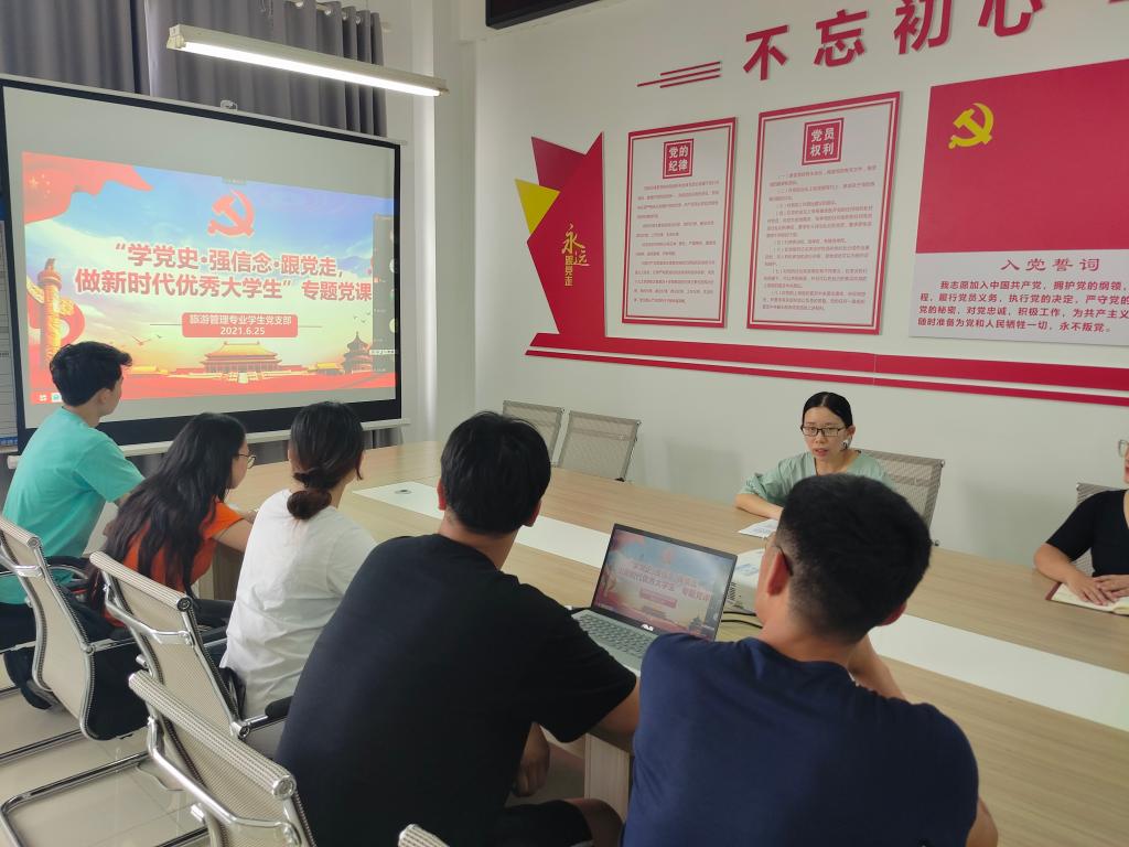 为庆祝中国共产党成立100周年,扎实推进党史学习教育,引导支部党员学史明理、学史增信、学史崇德、学史力行。6月25日,旅游管理专业学生党支部开展了党史学习教育专题党课。党课由支部书记徐晓琰主讲,旅游管理专业学生党支部全体党员参加。