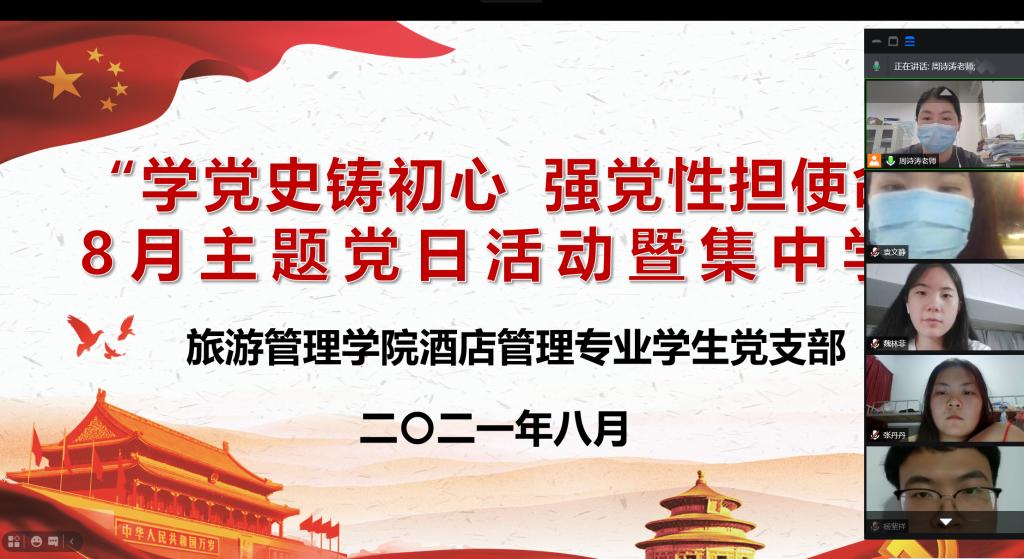为深入学习贯彻习近平新时代中国特色社会主义思想,进一步加强师生党史学习教育,传承红色基因,赓续红色血脉。8月13日,旅游管理学院酒店管理专业学生党支部在线上开展了“学党史铸初心,强党性担使命”8月主题党日活动,酒店管理专业学生党支部党员及部分入党积极分子参加了此次活动。活动由党支部书记周诗涛主持。