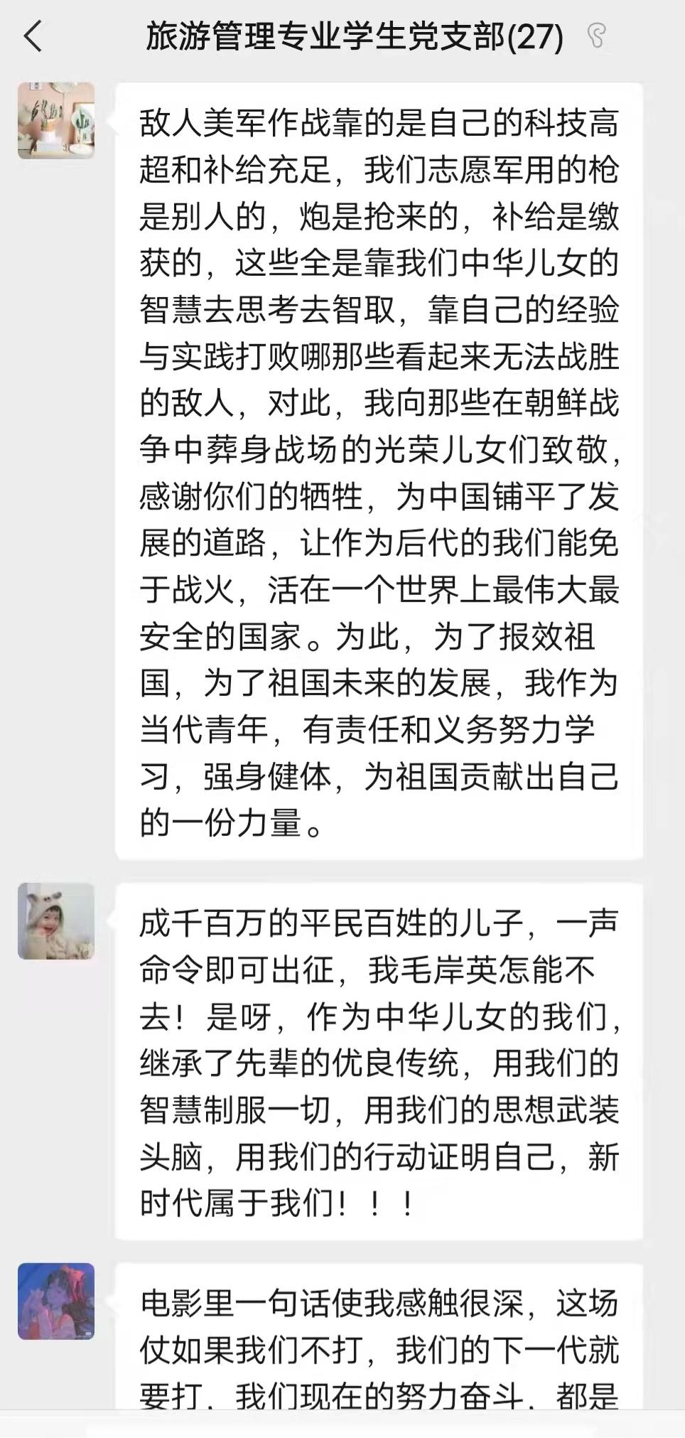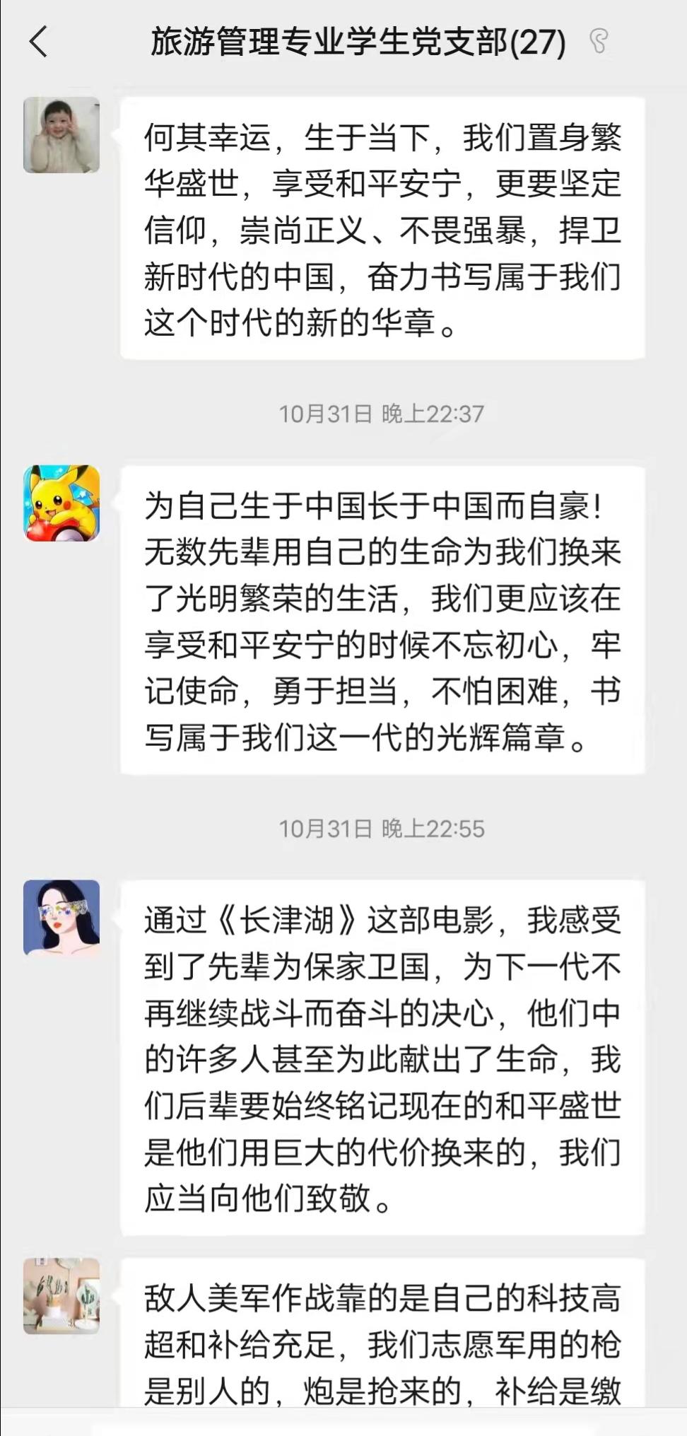 为深入开展党史学习教育,深切缅怀革命先辈,传承抗美援朝精神,赓续红色血脉,从历史中汲取前进的智慧与力量,2021年10月31日,旅游管理专业学生党支部组织全体党员观看了爱国主义教育影片《长津湖》。