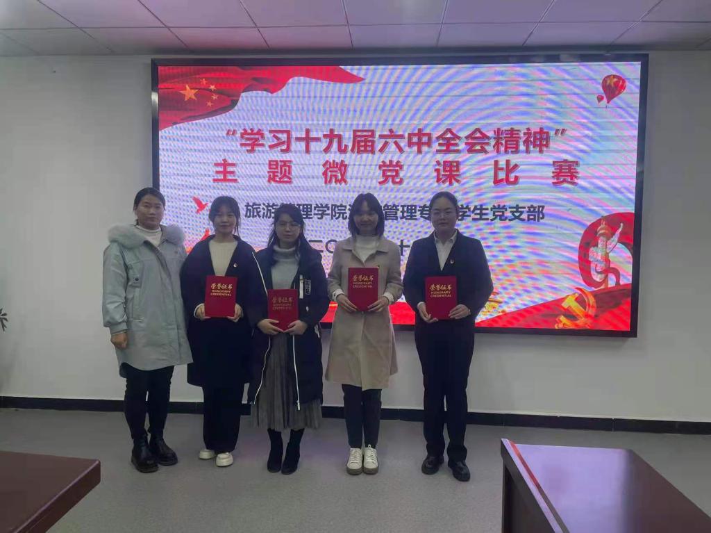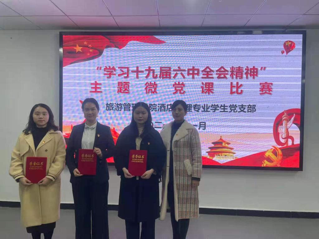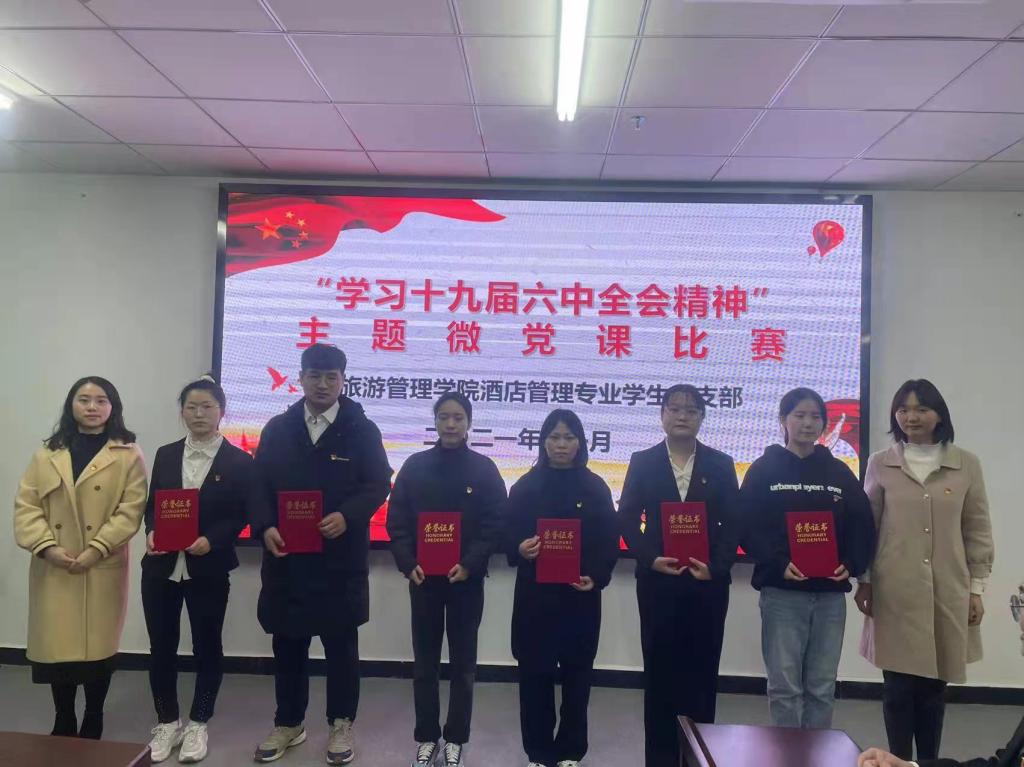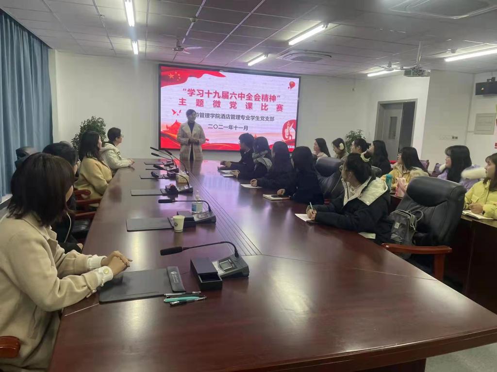 为深入学习贯彻十九届六中全会精神,扎实推进党史学习教育,11月26日晚,旅游管理学院酒店管理专业学生党支部在双创中心310会议室开展了“学习贯彻十九届六中全会精神”主题微党课比赛。比赛由支部委员王芳老师主持,支部在校学生党员和教师党员参加本次比赛。