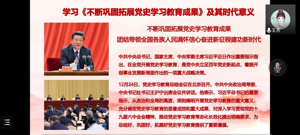 会上,王芳老师围绕“中国共产党的成立”、“历史和人民为什么选择中国共产党”、“中国共产党带领人民取得新民主主义革命的胜利”、“走好新时代的长征路”四个方面内容,带领大家回顾了1919年到1949年中国共产党经历的波澜壮阔的历史。随后,党支部成员共同讨论了学习党史的感悟,并深刻认识到了中国共产党为什么能,马克思主义为什么行,中国特色社会主义为什么好。最后,支部书记周诗涛老师呼吁支部党员同志在做好疫情防控的前提下,充分发挥党员先锋模范带头作用,积极到社区、村支部报到,协助做好疫情防控志愿服务,用实际行动践行所学,为家乡出一份力。