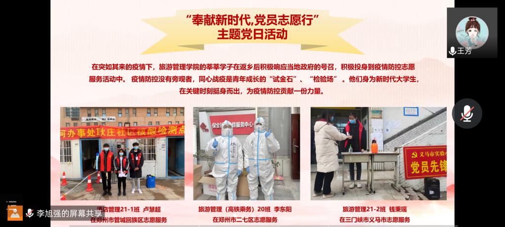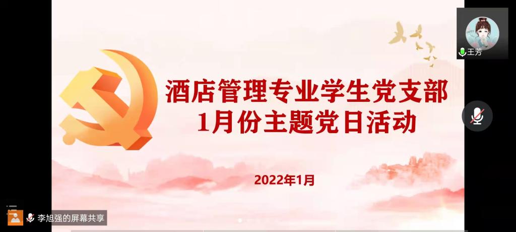 为加强党史学习教育,增强我院学子的社会责任感,提升为社会奉献服务的能力,酒店管理学生党支部于2022年1月14日中午通过线上腾讯会议开展“奉献新时代党员志愿行”主题党日活动。党支部全体成员参加了会议,会议由支部宣传委员王芳老师主持。