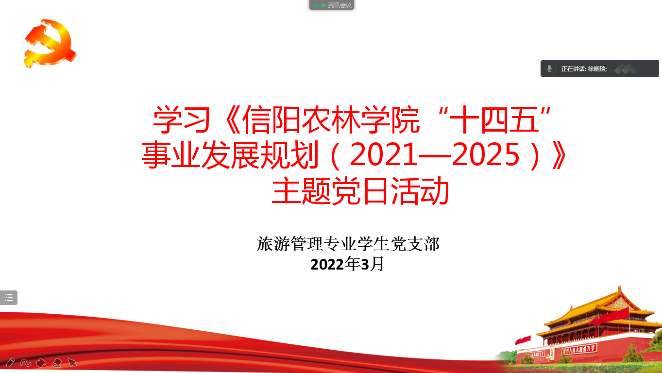 3月19日,旅游管理专业学生党支部以线上线下相结合的形式,开展3月主题党日活动,专题学习《beat365在线平台官网“十四五”事业发展规划(2021—2025)》。会议由徐晓琰主持。