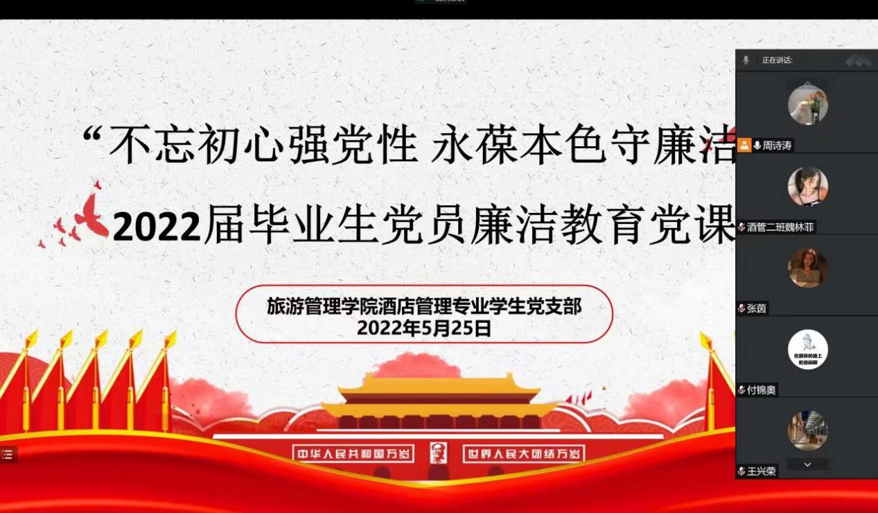 为加强2022届毕业生党员教育,引导毕业生党员坚定理想信念,树立廉洁自律意识,走好职场人生第一步,2022年5月25日,酒店管理专业学生党支部开展了以“不忘初心强党性 永葆本色守廉洁”为主题的毕业生党员廉洁教育会议。党支部书记周诗涛担任主讲,支部委员及毕业生全体党员参加了会议。