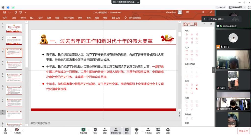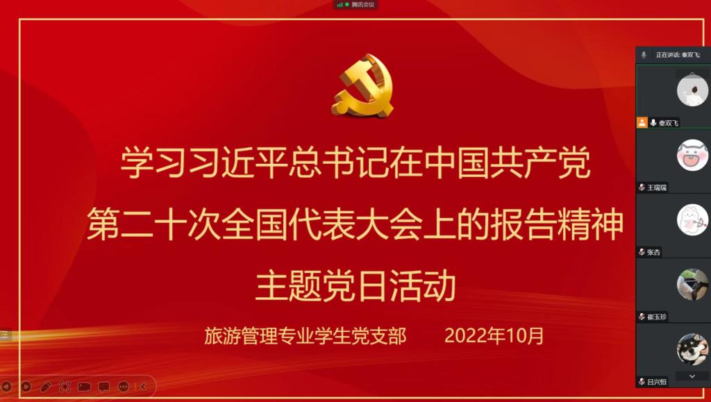 10月19日,旅游管理专业学生党支部线上开展了“学习习近平总书记在中国共产党第二十次全国代表大会上的报告”为主题的党日活动。支部全体党员参加了会议,会议由支部书记秦双飞主持。