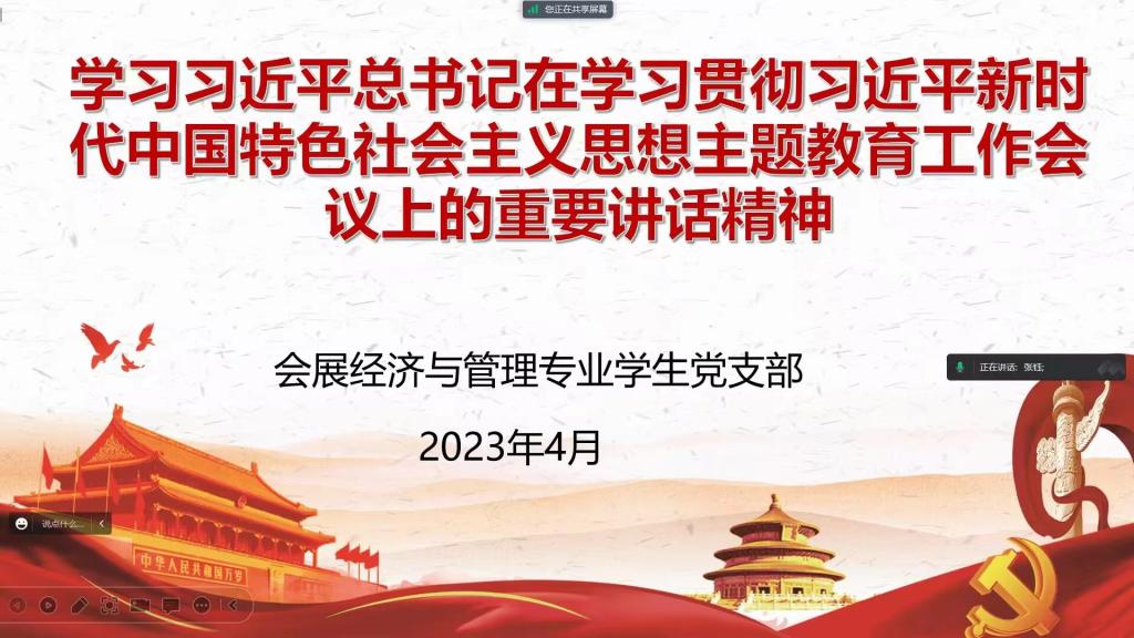 4月26日下午,会展经济与管理专业学生党支部线上开展“学习习近平总书记在学习贯彻习近平新时代中国特色社会主义思想主题教育工作会议上的重要讲话精神”4月主题党日活动,会议由支部书记易冉主持。