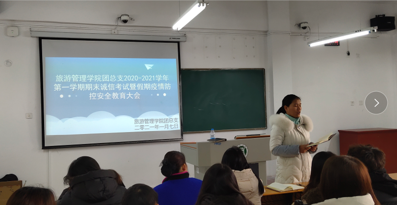 一个学期的忙碌接近尾声,为保证期末考试的顺利进行及学生假期前后的安全,旅游管理学院于2021年1月7日中午在二教112召开了2020-2021学年第一学期期末诚信考试暨假期“疫”情防控安全教育大会,此次大会由团总支书记王芳老师主持,张春焕、易冉、张博、秦双飞4位辅导员老师以及院各年级学生干部、学生代表参加了此次大会。