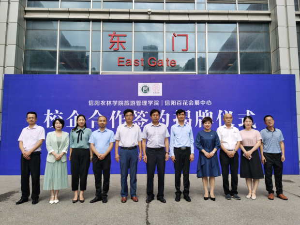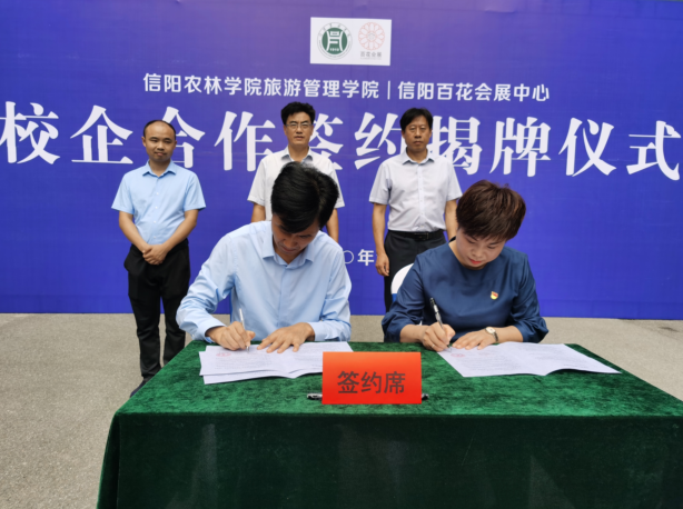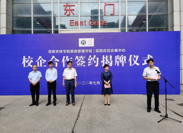 2020年7月28日,beat365在线平台官网旅游管理学院与信阳百花会展资产管理有限责任公司在信阳百花会展中心举行校企合作签约揭牌仪式。副校长赵一鹏、信阳市财政局党组成员、市担保服务中心主任叶中林、旅游管理学院院长刘开华、旅游管理学院党总支书记陈建国、信阳市百花会展资产管理有限责任公司党支部书记、总经理马莉出席揭牌仪式,旅游管理学院部分专业教师及百花会展中心全体工作人员参加。