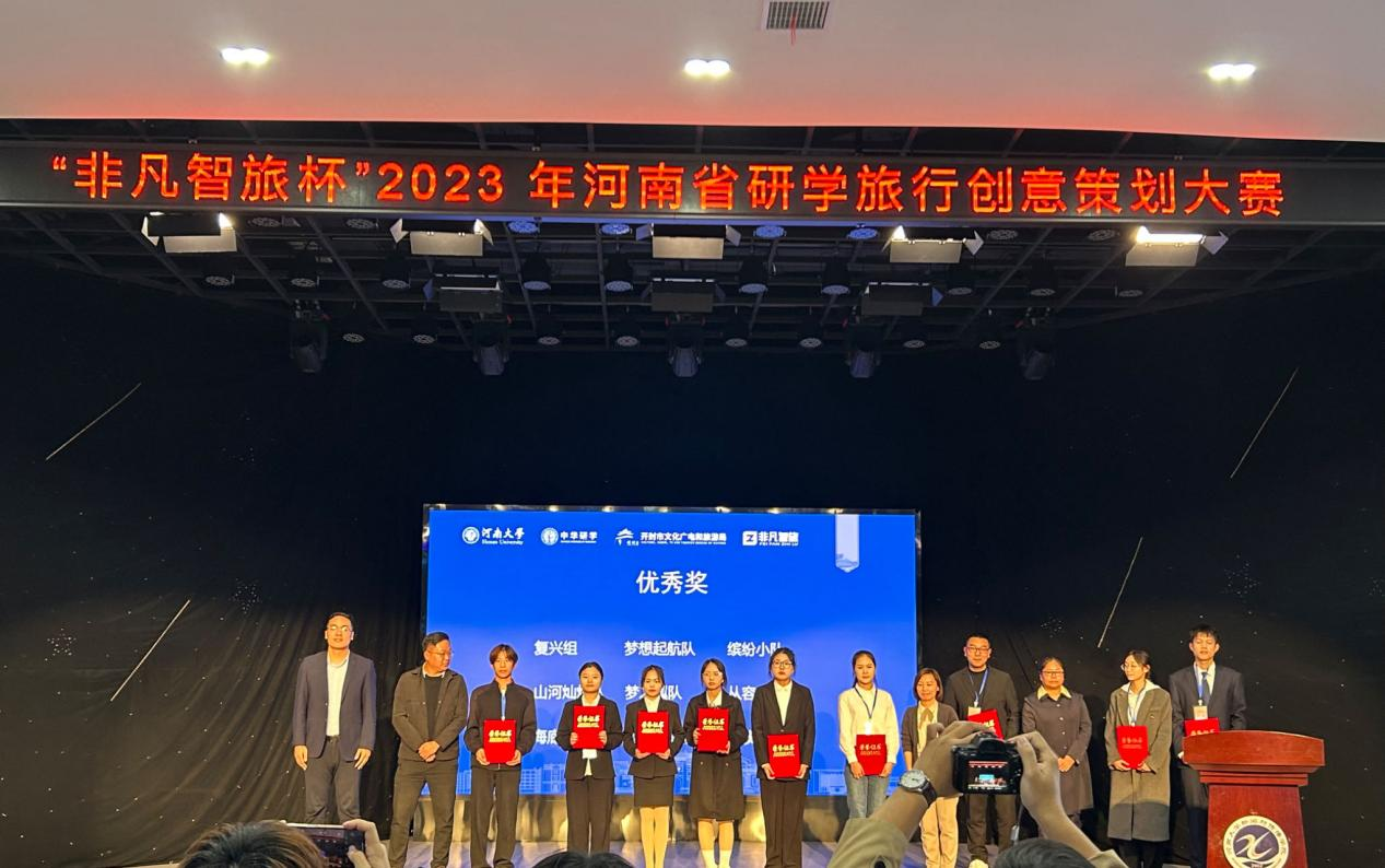 本次大赛由河南省文化和旅游厅指导,中华儿童文化艺术促进会研学旅行工作委员会、开封市文化广电和旅游局等单位共同举办,以“寻迹黄河,豫见中国”为主题。在决赛现场,21支参赛队伍分别从“风采展示、方案展示、现场答辩”三个方面展现了团队的方案创新理念。最终,经过4小时的激烈角逐,我院学子获得了河南赛区决赛优秀奖的成绩,并通过本次大赛汲取了宝贵的学习经验,展现了百折不挠的竞赛精神。