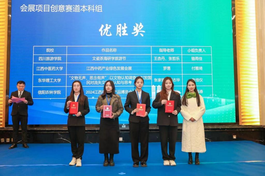 本次大赛经过近两个月的激烈角逐,共有120支队伍进入决赛,每个组别的每个赛道分别选拔出20支参赛队伍。我院师生在会展项目创新赛道本科(研究生)组,比赛从主题选择到内容构思都在指导老师悉心指导下顺利进行,参赛学生模拟展会现场,设计了符合大赛主题的原创Logo设计、展示了特色江西农产品。最终,我院学子获得了优胜奖的好成绩,展现了旅游学院师生的风采,也进一步提高了beat365在线平台官网的知名度。