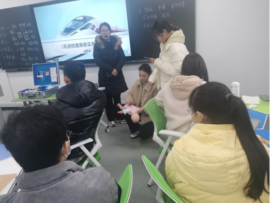 综合演练环节,学生分别对列车消防、旅客受伤、卧铺重售、餐车故障导致残料不足、旅客休克进行紧急抢救、列车行驶中突发传染疾病6个情景进行演练,各组通过剧情讨论、彩排,纷纷呈现出了非常精彩的演练效果。中英文语音播报、旅客纠纷处理技巧、客运记录和铁路电报的撰写、应急预案、应急处置方法等知识,在演练中都得到了非常好的运用。