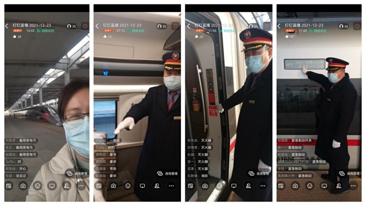 实地参观环节,张老师通过钉钉直播,带领学生们实地参观、了解信阳东站的周边及站内设施设备,并邀请高铁站崔师傅全程陪同,引领学生们熟悉高铁购票、咨询服务、进站安检、检票进站、站台乘车、出站等各环节的具体流程。直播过程中,学生积极与张老师、崔师傅进行连麦互动,咨询所学的专业知识。此外,张老师还登上信阳东始发的G553次动车组列车进行直播,带领学生观摩乘务人员的日常工作,以及动车组列车上的各种设施设备。