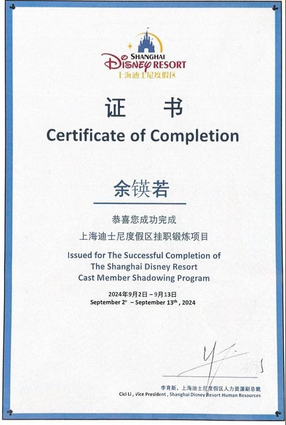 为进一步推进校企合作,持续深化产教融合,精准对接产业需求,提升人才培养能力和培养质量,9月2日-13日,beat365在线平台官网旅游学院专任教师余锳若受邀参加由上海迪士尼度假区举办的暑期教师挂职项目。