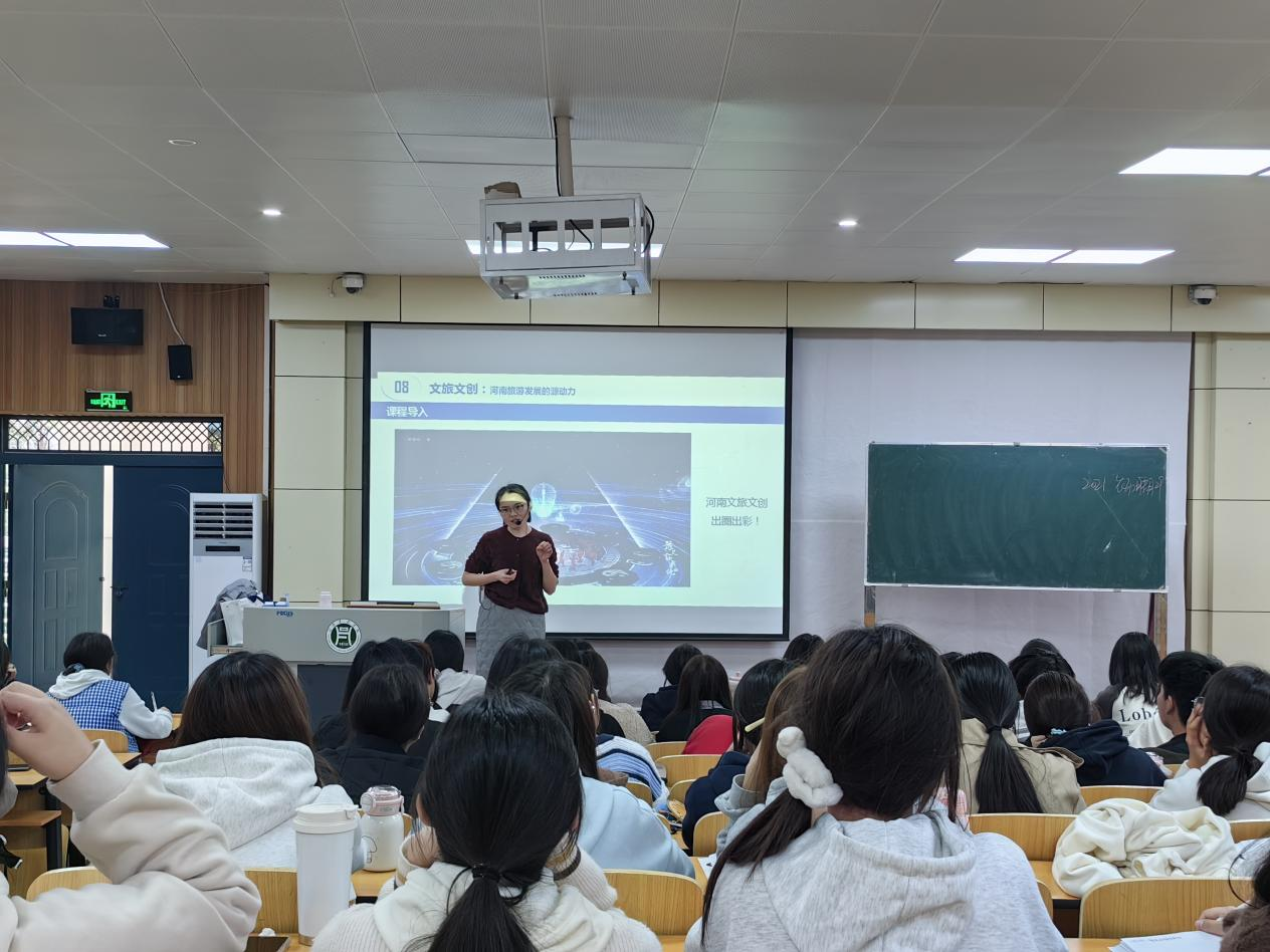 课堂上,史亚奇以河南省丰富的文化旅游资源作为切入点,通过生动的案例和详实的数据,展示了河南省在文旅融合方面的显著成就及其结合现代创意设计、挖掘旅游文化资源以推动文化旅游产业的创新与发展的方法。在课程教学中,史亚奇采用BOPPPS的教学理念、运用多媒体教学,融合案例分析、课堂讨论、课堂测试等多种互动方式吸引学生的兴趣,课堂氛围活跃,教学成效显著。