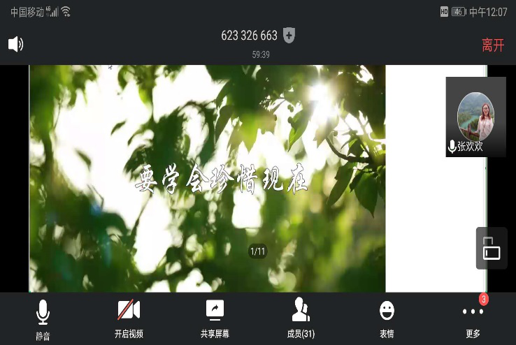 张欢欢老师表示,病毒无情,人间有情,学校始终把师生生命安全和身体健康放在首位,始终深切牵挂着每一位学子,用严之又严、细之又细、慎之又慎的实际行动保障大家平安健康、绽放光彩。并在活动中提出四点希望:一是要笃其志,坚定理想信念;二是要践其行,磨砺责任担当;三是要学其精,练就过硬本领;四是要强其身,拥有健康体魄。最后,张欢欢老师强调,2020年是难忘的、不平凡的一年,社会即课堂,生活即教育,让全体师生汇聚青春的力量,在艰苦奋斗中砥砺意志品质,在严峻斗争中交出合格答卷,以“只争朝夕,不负韶华”的奔跑姿态接续奋斗,让灾难见证我们坚定成长的足迹,让不幸成为通向幸福的桥梁,让青春在磨砺中更加出彩,让人生在奋斗中闪光升华。