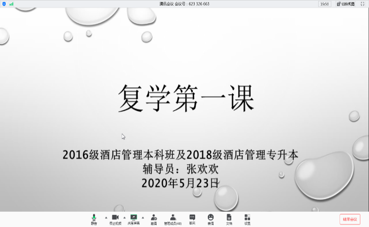 为帮助毕业生返校期间掌握疫情防控知识、增强疫情防控意识、提高疫情防控能力,引导学生关注自身心理健康、保持昂扬向上的精神面貌,坚定战胜疫情的信心,5月23日,旅游管理学院组织开展线上“复学第一课”主题活动,教育学生涵养爱国主义情怀,此次活动由16级毕业班辅导员张欢欢老师主持开展。