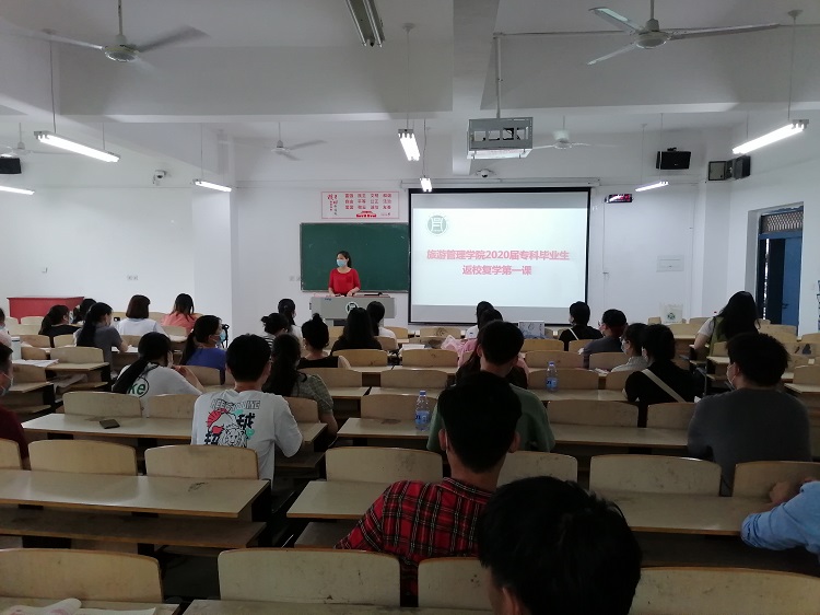 为切实做好专科毕业生返校后的疫情防控、安全教育、心理疏导、就业指导等工作,7月2日上午,旅游管理学院于二教201开展了2020届专科毕业生返校复学第一课活动。学院党总支副书记杜丽、副院长陈婷、毕业生辅导员罗志涛、张洋及返校学生参加了活动。活动由杜丽主持。