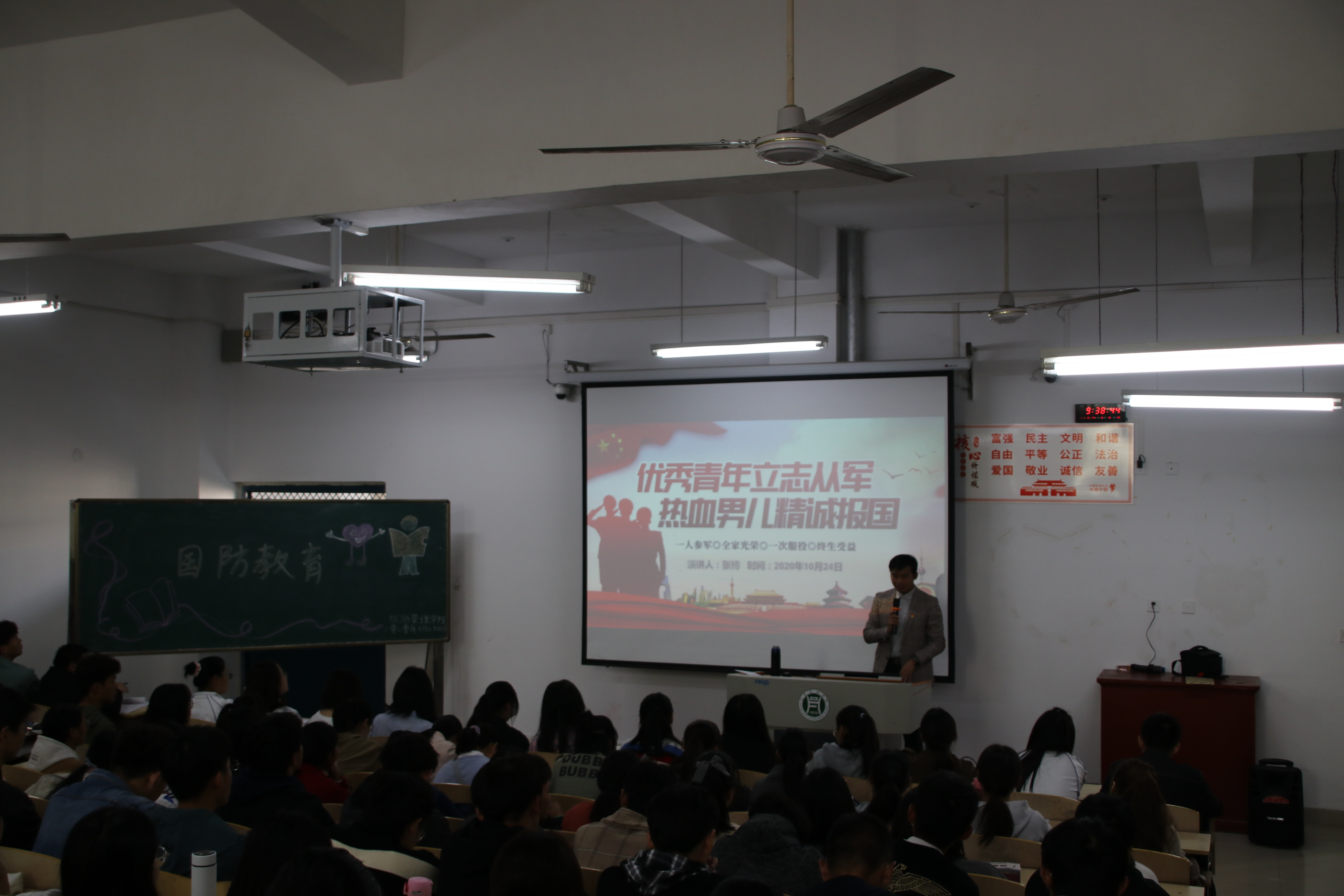 为了增强学生的国防观念,提升国防意识10月24日晚,旅游管理学院分别在二教305和二教306开展国防教育讲座,由武装专干张博主讲,新生辅导员及2020级全体新生参加。