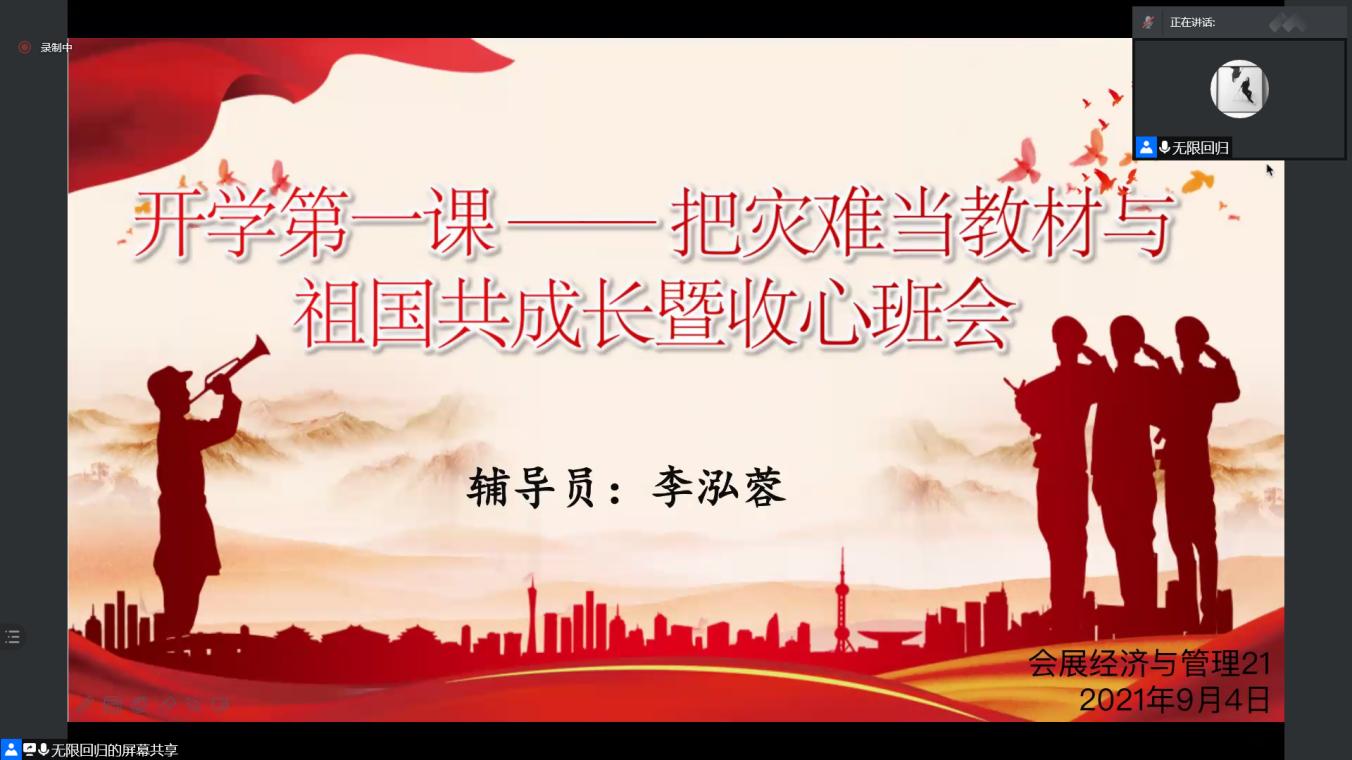新学期开学在即,旅游管理学院于9月3日-6日组织各班开展了线上“开学第一课”——“把灾难当教材,与祖国共成长”暨新学期收心主题班会,班会由各班辅导员主持。