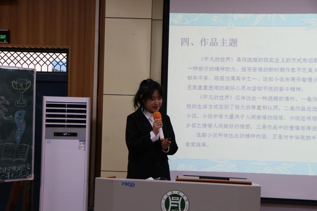 活动中,杜丽进行了发言,她提到,好书分享会既是对前段读书活动的集中检阅,也是对今后读书活动的再次促进。读书可以拓宽我们的眼界,获得丰富的知识,能引导我们明理,养成良好的学习习惯,学会如何做个有修养的人。作为新时代大学生,要从书中汲取营养来滋润和提升自己的素养,以饱满的精神投入学习和生活中去,以脚踏实地地做好每一件细小的事为乐趣,从而成就自己的成长,书写自己的美好人生。