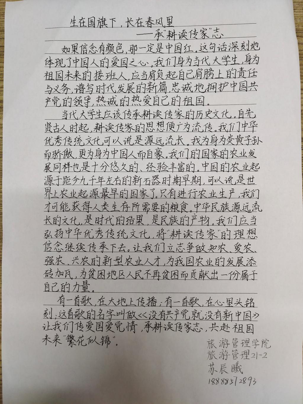 为抒发同学们的爱党爱国情怀,传承红色基因,弘扬“耕读文化”,继承和发扬中华优秀传统文化,旅游管理学院于11月27日-12月3日举办了“大学生科技文化艺术节”艺术作品大赛。