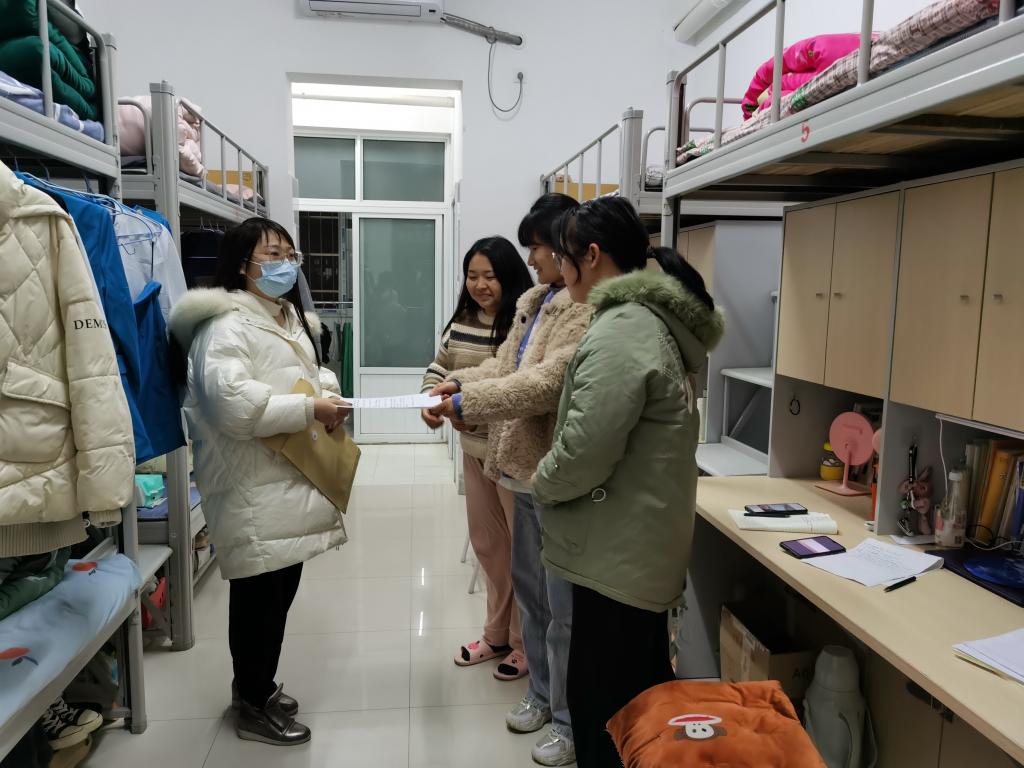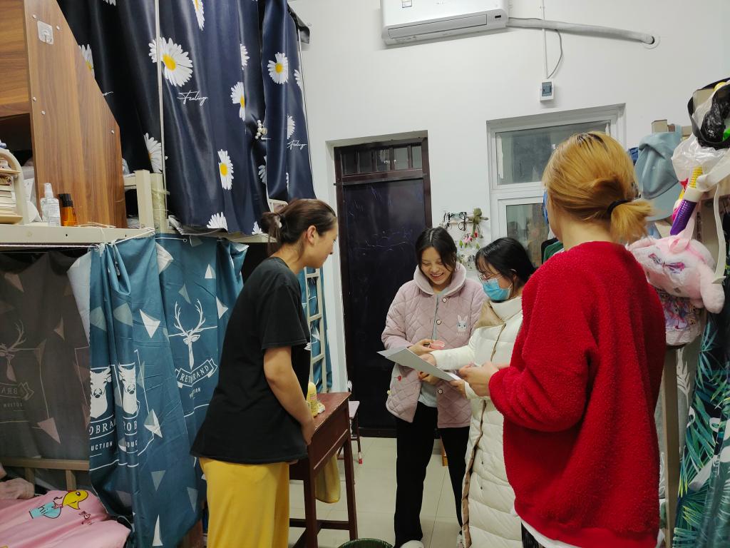 本次检查中发现绝大多数宿舍卫生状况良好,整体符合标准,但个别宿舍存在杂物乱堆放乱等问题。检查组老师们对发现的问题现场进行了纠正,并要求学生立即整改;同时提醒学生不能留宿外来人员、不能晚归和夜不归宿,严格遵守学校疫情防控要求,不以任何理由擅自离开学校。