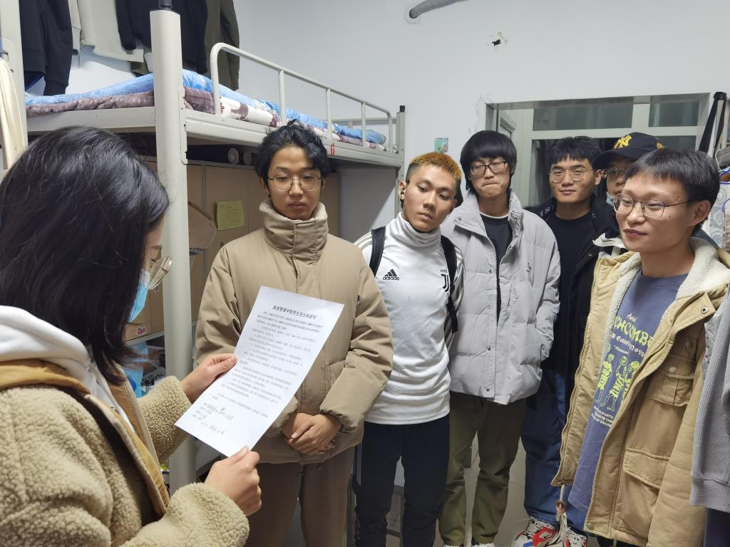 在检查过程中,老师们通过和学生亲切交流,了解学生们近期的思想动态、生活情况、学习情况。同时,除了对学生宿舍内卫生、内务方面进行检查,老师们重点对宿舍安全隐患进行了排查,着重检查学生是否使用大功率电器、防限电插座、宿舍防火防盗措施是否到位、是否有在宿舍抽烟、喝酒行为等一系列可能出现安全隐患的问题。在检查过程中,检查组的老师们给每个宿舍讲解了宿舍安全的注意事项和重要性,同时每个同学都在《旅游管理学院学生安全承诺书》上签下了自己的名字,承诺严格遵守校纪校规,维护安全有序的校园环境。