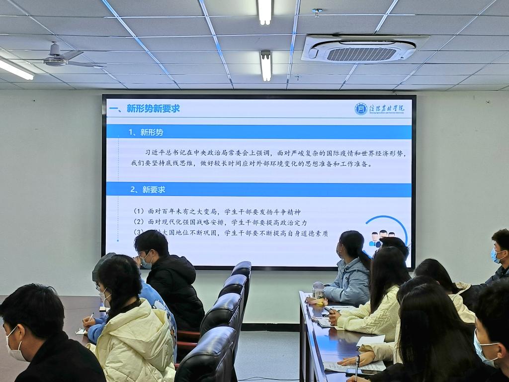 刘开华院长从当前国内及国际形势出发,传达了习近平总书记在中央政治局常委会上关于严峻复杂的国际疫情及世界经济形势所作的重要讲话精神,同时向同学们详细介绍并分析了我国当前面临的复杂多变的国内及国际形势特点,号召全体学生干部,一是面对百年未有之大变局,要坚持底线思维,充分发扬斗争精神,在斗争中明辨是非,确立目标,担当大任;二是面对我国现代化强国的战略安排,要始终拥护中国共产党的领导,坚定理想信念,关注形势与政策发展,学会在国际形势与发展的对比中稳定自身发展,自我加压,不断提高自身的政治定力和能力;三是面对我国大国地位的不断巩固,要树立远大理想,锤炼吃苦耐劳精神,培养格调高雅的审美情趣,不断提高自身道德素质。会上,刘院长还结合自身经历围绕学生干部的角色定位、学生干部应具备的素质和能力水平以及工作方法及艺术三方面内容对学生干部做了详细培训,号召新一届学生干部要进一步明确自身的角色目标,练就过硬的专业素质和工作方法水平,协调好与老师、同学之间的关系,凝聚团队力量,历练精彩人生。