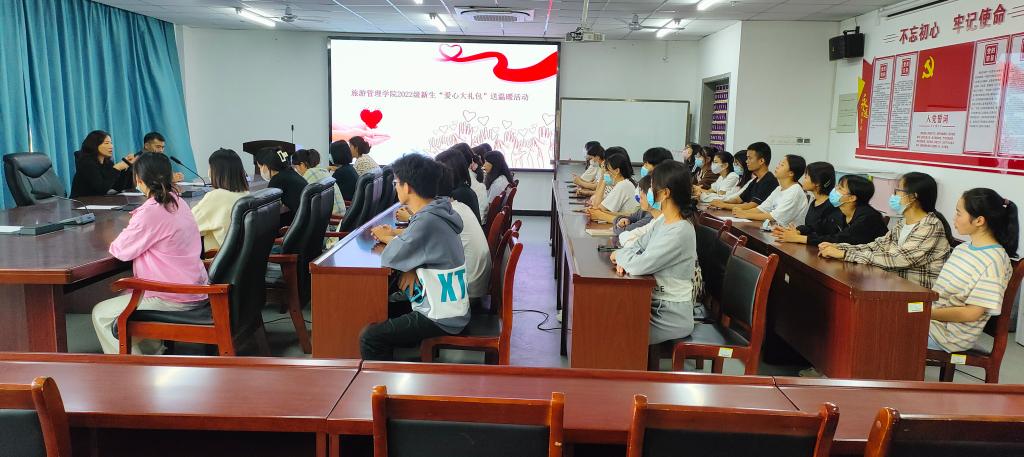 为更好地贯彻落实国家资助政策,进一步加强学生资助工作成效,体现学校对家庭经济困难学生的关怀。2022年9月21日中午,旅游管理学院开展了2022级新生“爱心大礼包”送温暖活动,旅游管理学院党总支副书记杜丽、专职辅导员张博、张春焕及39名贫困学生参加本次活动。