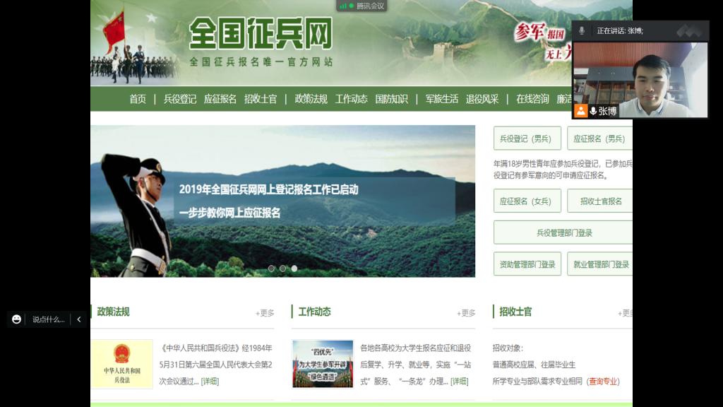 会上,张博为学生们详细解读了当前国际形势,重点介绍了我国周边安全形势,同时解读了大学生入伍相关优惠政策、兵役登记的重要性和报名应征入伍的流程,充分调动了同学们报名应征入伍的积极性。张博老师寄予同学们大学期间要不负青春,不负韶华,不负时代,系好人生第一粒扣子,为实现中华民族伟大复兴贡献自己的聪明才智,为维护国家安全做出自己应有的贡献。