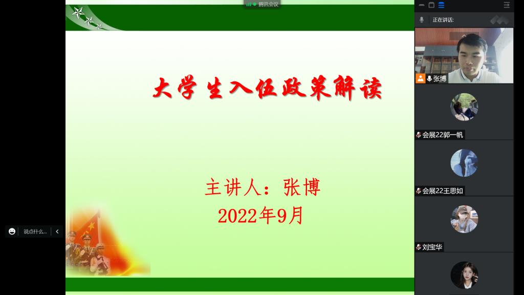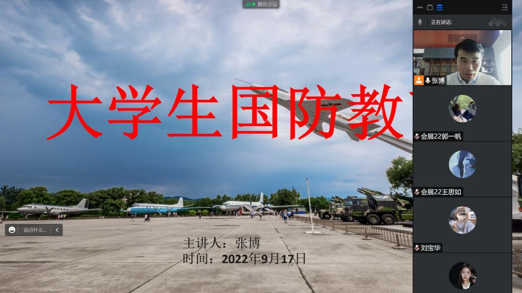 为进一步加强新生国防意识,增强国防教育观念,培养学生们的爱国情怀,9月17日上午,旅游管理学院通过腾讯会议开展了新生入学教育系列之国防教育专题培训,会议由武装专干张博老师主持,2022级全体新生参加了会议。