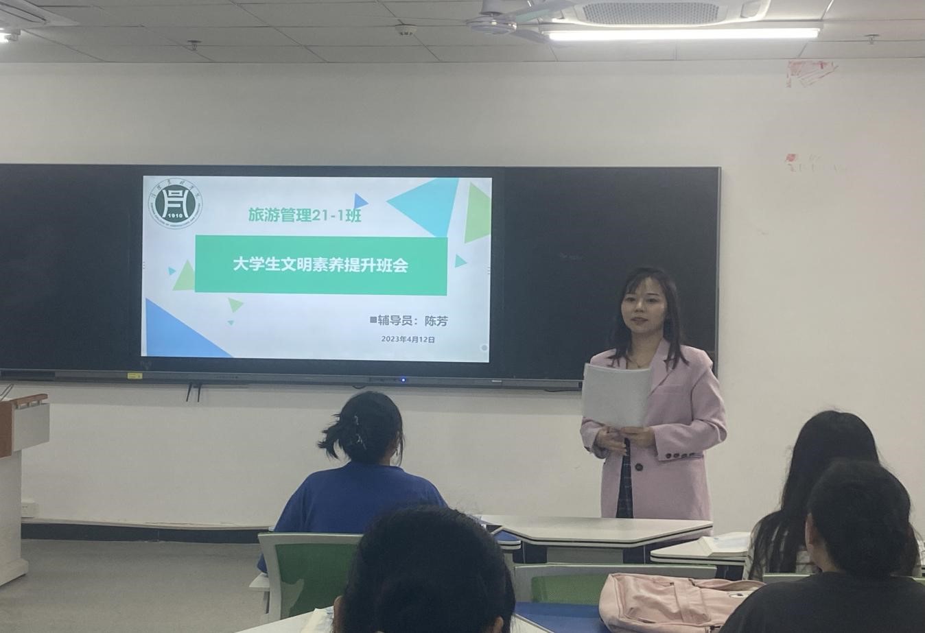 为切实提高我院学生文明素养和道德水平,进一步优化学院育人环境,4月10日-14日,旅游管理学院组织召开“大学生文明素养提升”主题班会,班会由各班辅导员主持。