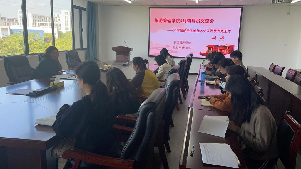 4月10日,旅游管理学院在双创中心310开展了4月份辅导员交流会之如何做好学生推优入党及评优评先工作。会议由党总支副书记杜丽主持。