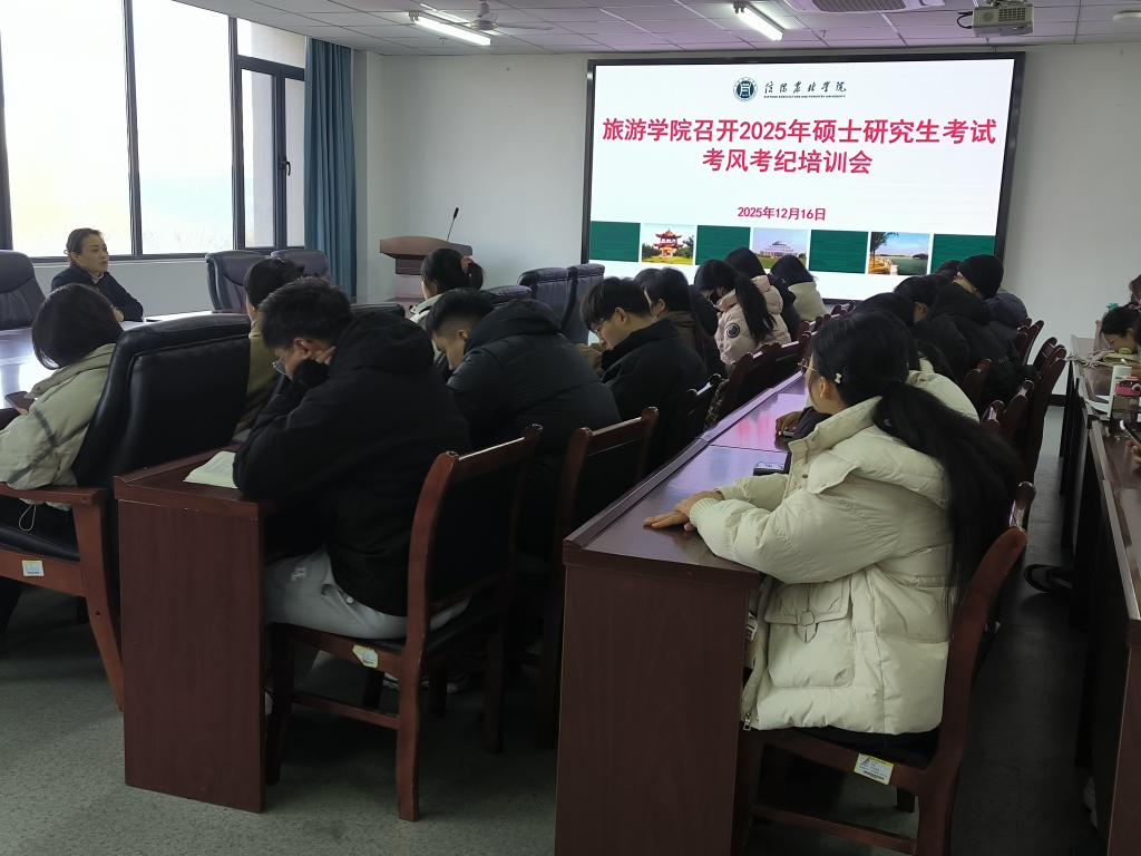 为营造公平、公正的考试环境,强化学生的诚信意识与纪律观念,旅游学院于12月16日在双创310召开2025年硕士研究生考试考风考纪教育培训会。副书记池水婧及即将步入考场的考研学子参加了本次大会。