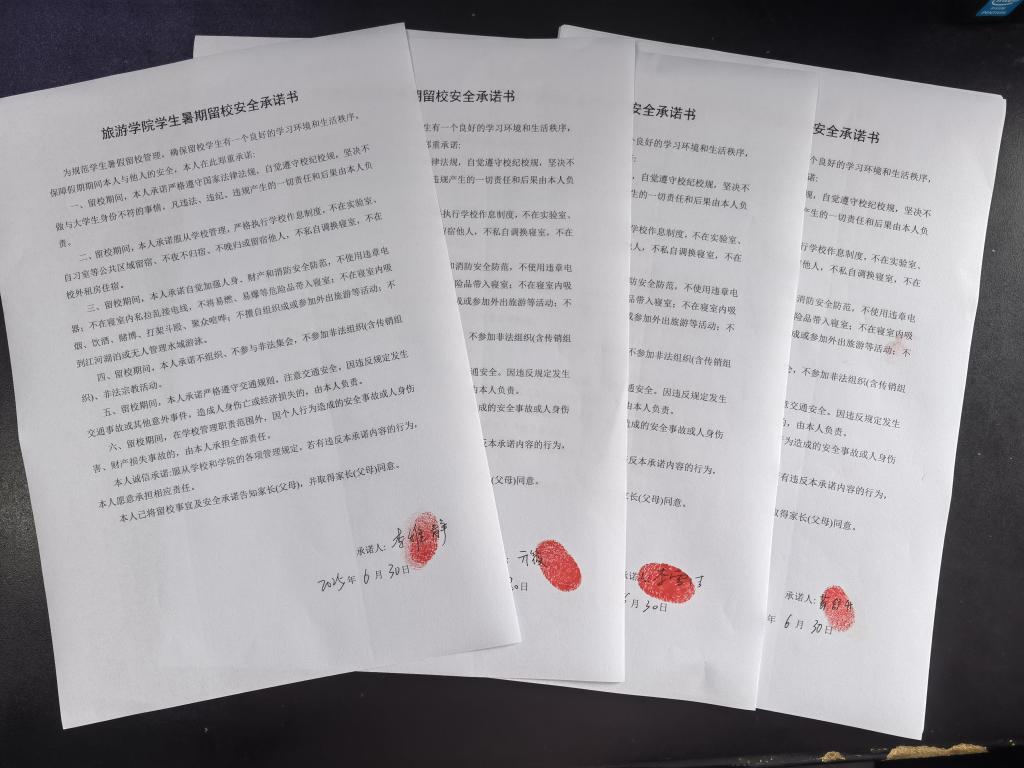 会后,留校学生逐一签署了《旅游学院学生暑期留校安全承诺书》,承诺自觉遵守各项安全管理规定。(撰稿/秦双飞 摄影/张音音)