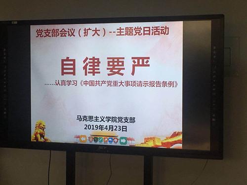 4月23日下午,马克思主义学院党支部开展主题党日活动,专题学习《中国共产党重大事项请示报告条例》,活动由马克思主义学院党支部书记邱兴平主持,马克思主义学院全体党员教师参加。